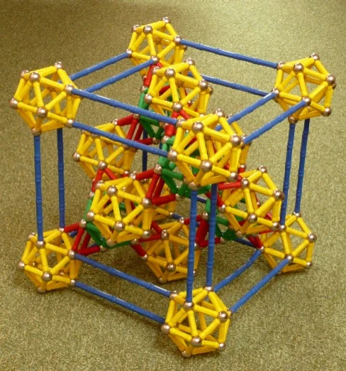 - To finish the delineation of the cell, make the 24 blue rods, and affix the yellow corner icosahedra on them. Because you fix the 6 degrees of freedom of the corners, they will magically float in space.